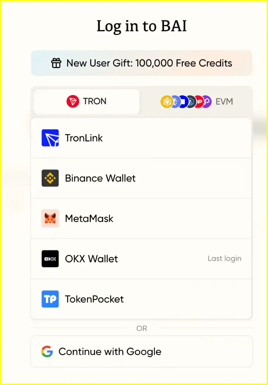 Currently, B.AI supports the TRON network of the Waves TRON as well as the BNB Chain, Ethereum, and other EVM networks, and users can log in using wallets such as TronLink, MetaMask, etc.