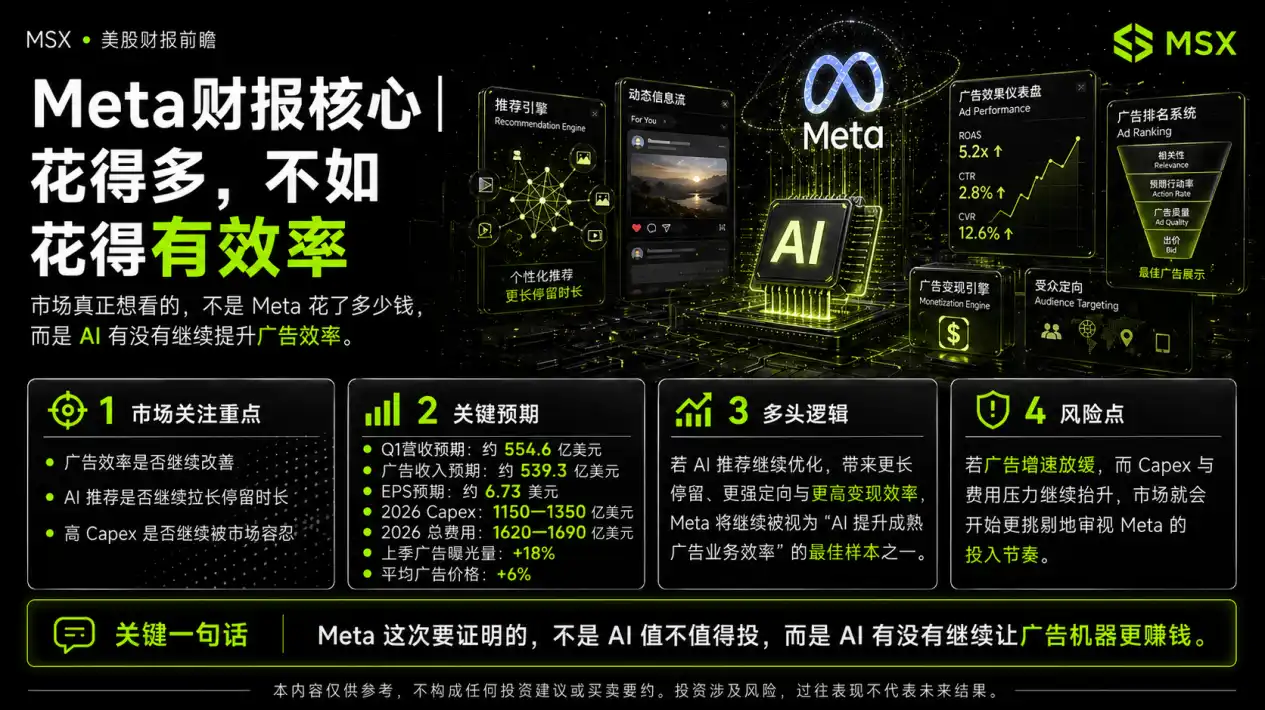 Leading up to the financial report, the mainstream market expectations were roughly Meta's first-quarter revenue of $554.6 billion, advertising revenue of $539.3 billion, and EPS of $6.73. These numbers are certainly important, but what truly determines market sentiment is the underlying logic chain: AI recommendation optimization → increased user engagement → improved ad efficiency → increased ad revenue → market's continued tolerance for high Capex. If this chain continues to hold, Meta will continue to be seen as one of the best examples of "AI enhancing mature business efficiency"; conversely, if ad growth slows down while capital expenditure pressure increases, the market will start scrutinizing its investment pace more critically.