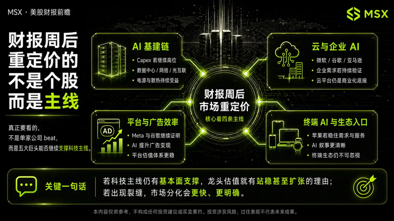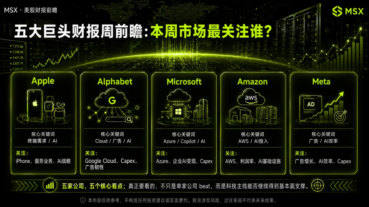 If we only look at individual companies, this week is certainly five separate earnings reports; but if we put them together, we will see that the market is actually conducting a larger cross validation. Microsoft is looking at whether AI has already formed an enterprise payment loop; Google is looking at whether the conference narrative can quickly translate into a dual realization of Cloud and advertising; Amazon is looking at whether high investment can coexist with high-quality profits; Meta is looking at whether AI can continue to enhance mature business efficiency; and Apple is looking at whether the end user entry point and ecosystem position remain solid.