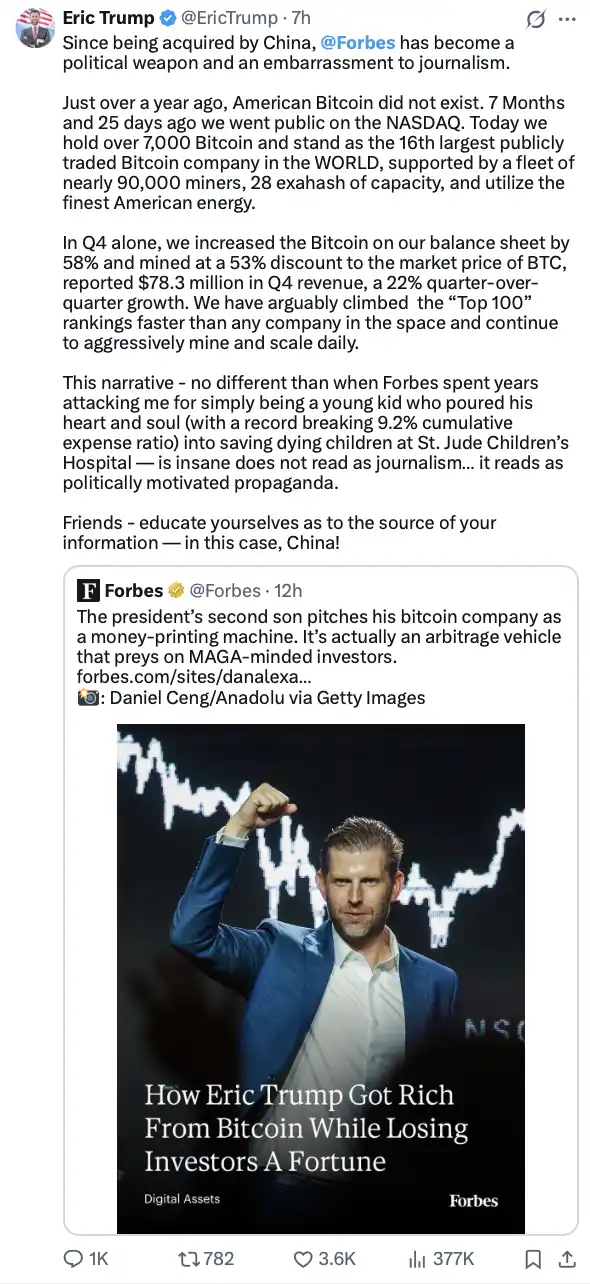 After the report was released, Eric Trump quickly fought back on Twitter, accusing Forbes of being acquired by China, claiming that the report was politically motivated propaganda, and presenting a string of operating data in rebuttal: 7,000 Bitcoins, nearly 90,000 mining machines, Q4 revenue of $78.3 million. Additionally, he brought up an old story from twenty years ago about fundraising for a children's hospital, trying to prove that Forbes has always been targeting such a "good person" like him.