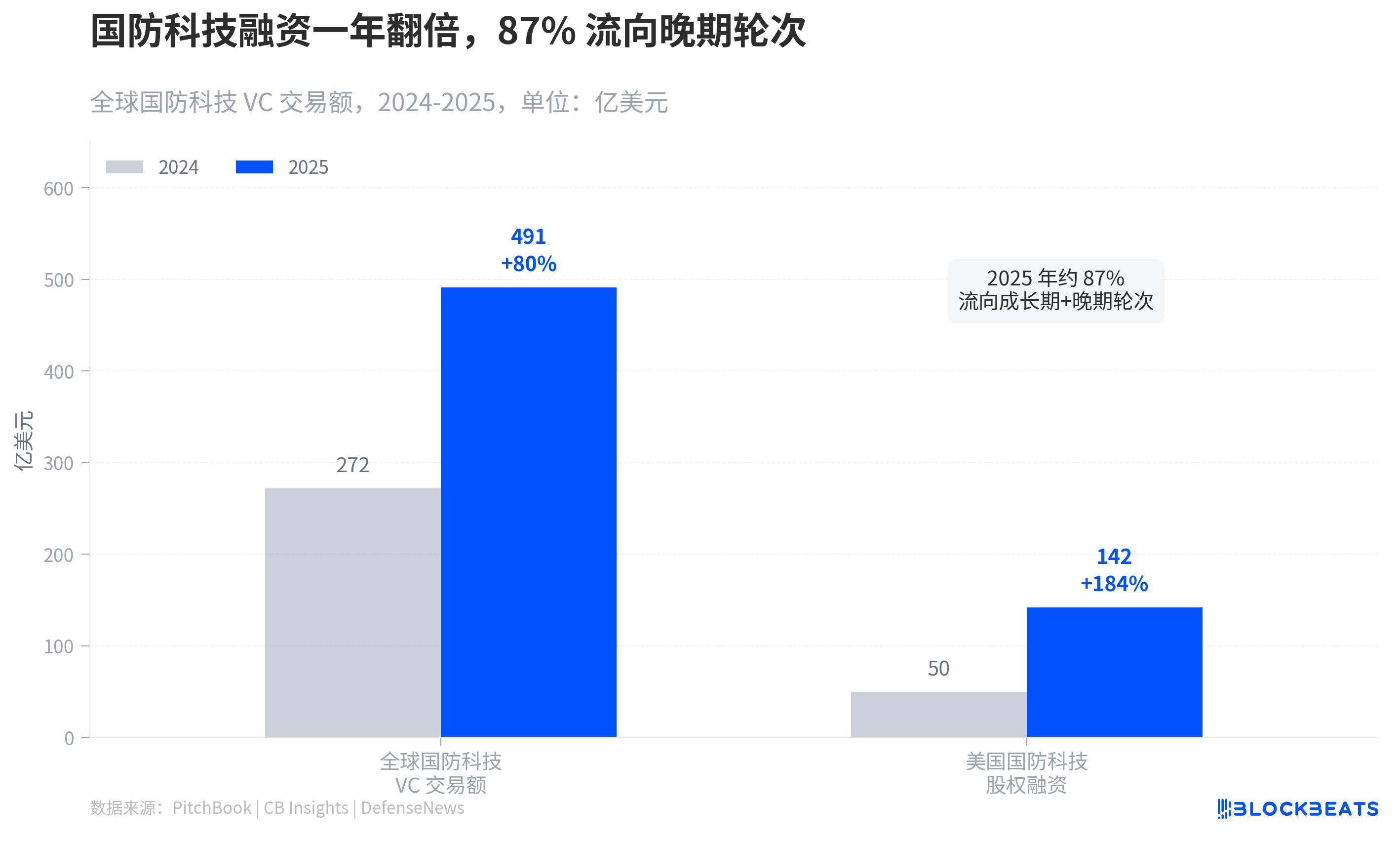 Per PitchBook data, global defense technology VC deal value hit $49.1 billion in 2025, nearly doubling from $27.2 billion in 2024. According to DefenseNews, domestic U.S. defense technology equity funding soared from $5 billion in 2024 to $14.2 billion, almost tripling. Approximately 87% of the capital flowed into growth and late-stage rounds. Funds are no longer directed at experimental prototypes but are going to companies ready for mass production and delivery. JPMorgan Chase estimates that since 2021, the global defense technology sector has attracted approximately $130 billion in venture capital.