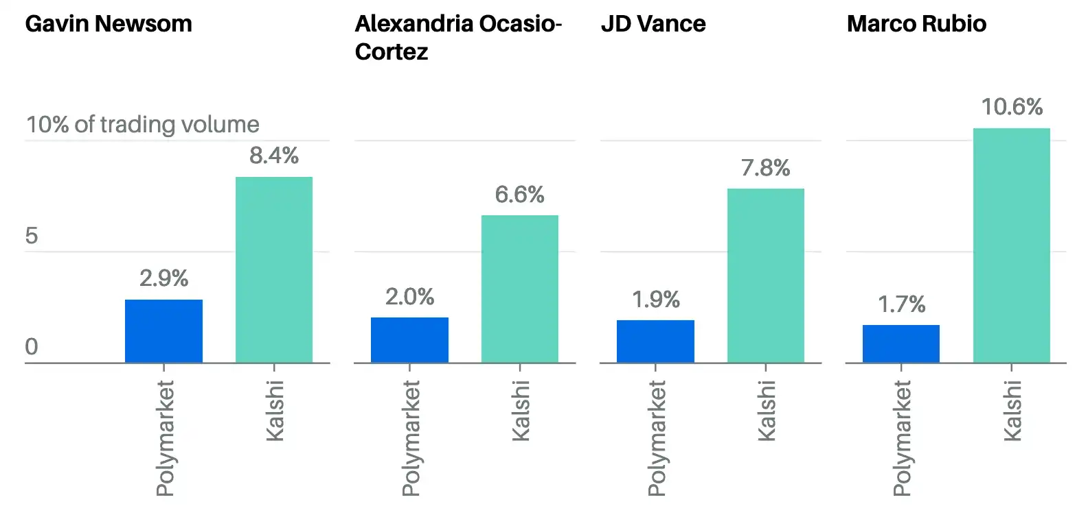 According to Barron's analysis of publicly available Polymarket data, presidential candidates with less than a 1% chance of winning have generated a total trading volume of around $386 million. These "super long shot" bets account for more than two-thirds of the total trading volume related to the 2028 election.