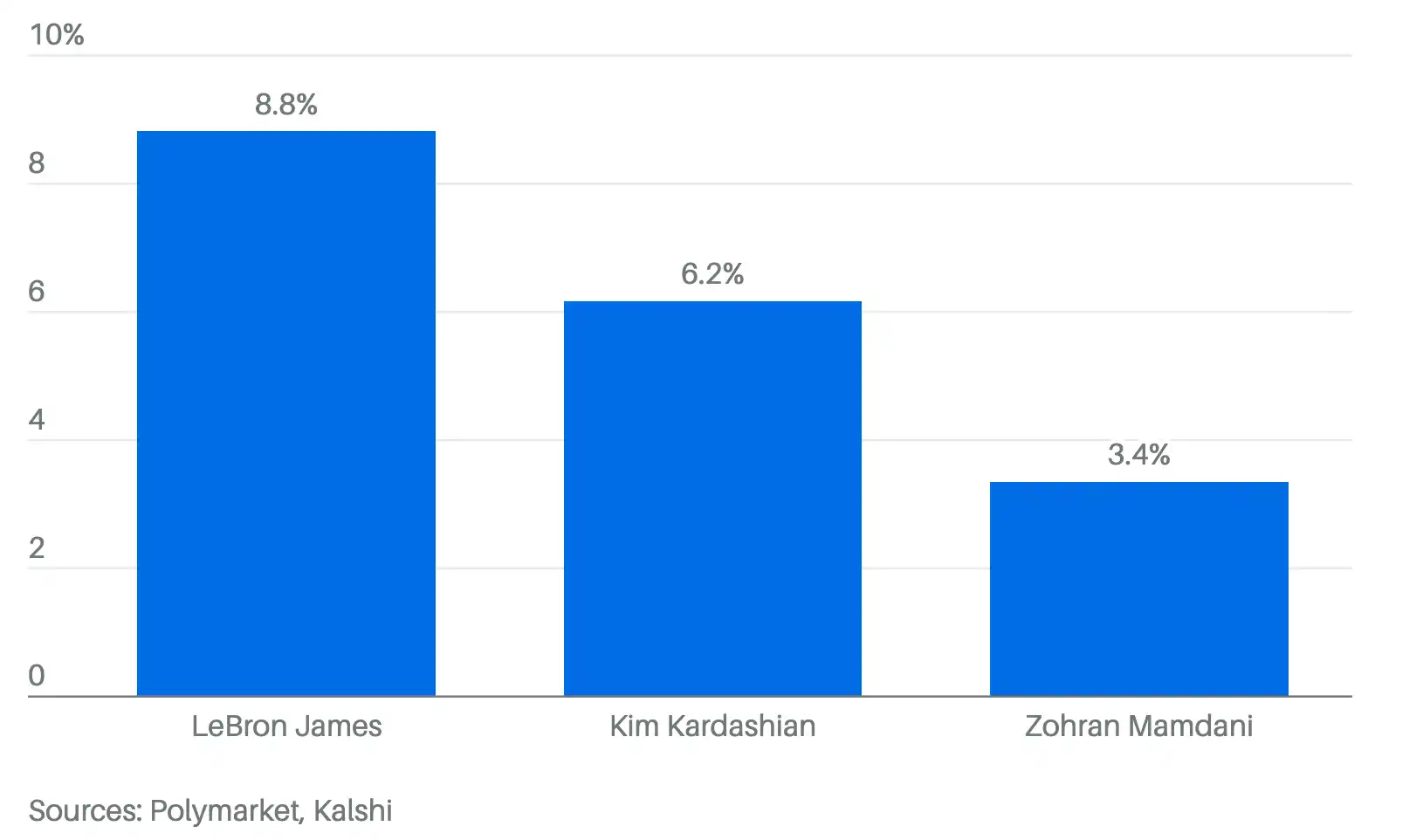 In the 2028 election market, the most crowded transaction actually belonged to basketball superstar LeBron James. The transaction associated with him amounted to $48 million, accounting for 9% of the total market volume. The second-highest transaction volume was from the current Governor of Minnesota, Tim Walz, who has already signaled his exit from elective politics. In third place was Kim Kardashian, with a transaction amount of $34 million.