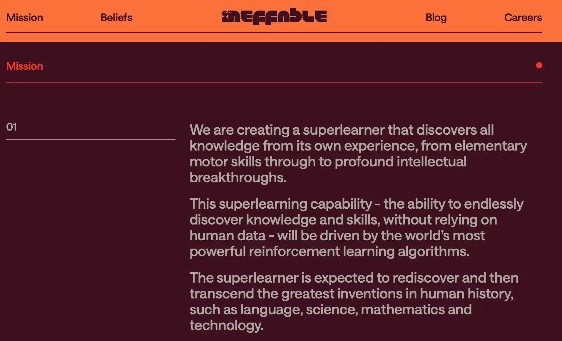 The goal Silver wrote on the Ineffable website is to create a superlearner. What it aims to do is not rely on any human-generated data but learn from scratch through its own "experience," starting from the most basic motor skills all the way to "profound intellectual breakthroughs."