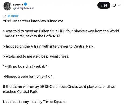 A Twitter user, Hampton, shared a memory of his 2012 interview. It reads somewhat like dark humor: they met in the financial district near Fulton Street, next to a Bank of America ATM near the World Trade Center. Then the interviewer took him on the A train towards Central Park. They played international chess on the subway. However, they had no board; it was all verbal. They tossed a coin to decide whether to start with 1.e4 or 1.d4. If they hadn't determined a winner by Columbus Circle on 59th Street, they would start speed chess until Central Park. Hampton said he lost at Times Square station.