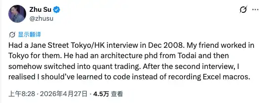 Zhu Su, founder of Three Arrows Capital, also tweeted a recollection: "In December 2008, I interviewed at Jane Street in Tokyo and Hong Kong. My friend was working in their Tokyo office at the time, a Tokyo University PhD in architecture who switched to quant trading. After my second round of interviews, I figured something out - I should learn programming instead of messing around with Excel."