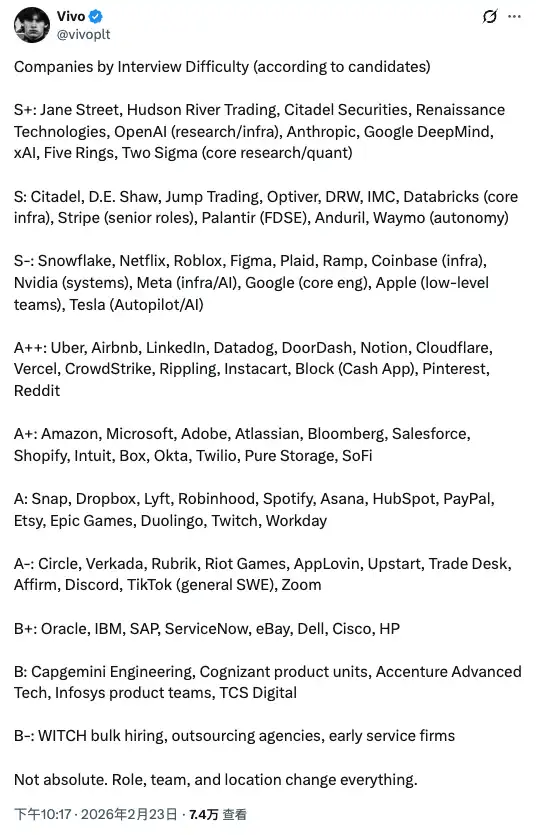 And Jane Street's company interview difficulty is among the top in the entire Wall Street. According to Twitter user @vivoplt's candidate interview difficulty ranking, Jane Street is at the top of the S+ difficulty level, on par with top AI labs.