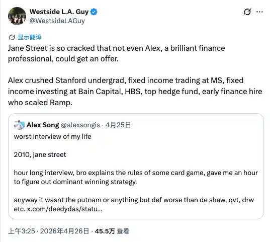 One interviewee said, "This is still the toughest interview process in investment banks. You can prepare for interviews at other companies, but you really can't prepare for Jane Street." Some even joked online, "If Oppenheimer were still alive today, I bet he still couldn't pass Jane Street's third-round interview."