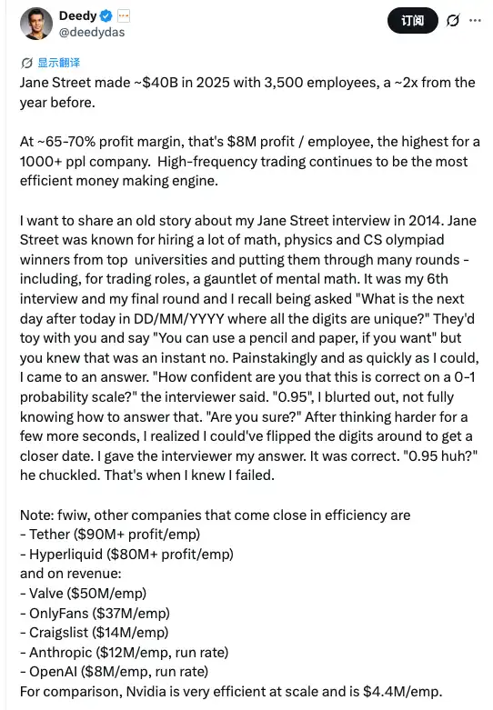 Based on a 65-70% profit margin, the company's per capita profit is approximately $8 million to $9 million. Among all companies with more than 1,000 employees worldwide, this is a record. Citadel Securities next door, with 1,800 employees, has a per capita profit of $3.6 million; Hudson River Trading is at $6.6 million; even a company like Nvidia, which is showered with money from around the world, has a per capita profit of only $2.9 million.