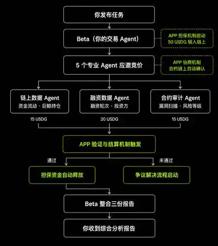 Five professional Agents were invited to bid simultaneously, and Beta reached agreements with the first three to collaborate: the on-chain data Agent responsible for tracking fund inflows and outflows and whale holdings, costing 15 USDG; the funding data Agent responsible for scraping the funding rounds, investors, and valuations of each project, costing 20 USDG; the contract audit Agent responsible for scanning for code vulnerabilities and risk levels, costing 15 USDG. The APP's negotiation mechanism came into play — each party reached an agreement with Beta on-chain, contracts were automatically confirmed, with no need for any manual intermediaries, and they began working independently.
