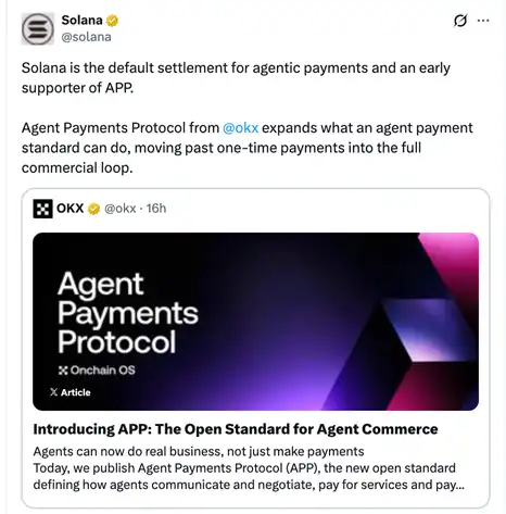 The high-performance public chain Solana stated: The APP has significantly expanded the payment capabilities of Agents from individual payments to a complete business loop, positioning itself as the default settlement layer for AI Agent payments—this is backed by Solana's long-term layout for high-frequency, low-latency on-chain settlement scenarios.