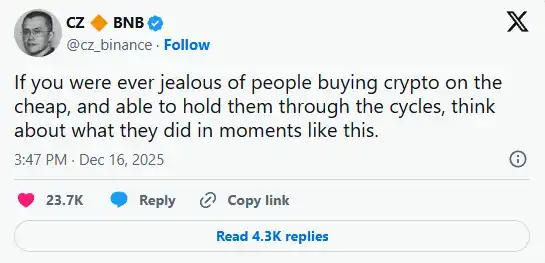 更有趣的是,官方文档中空投部分配上了 CZ 此前的一条推文(推文内容:「如果你曾经嫉妒那些低价买入加密货币并能熬过周期的人,想想他们在这样的时刻做了什么。」)