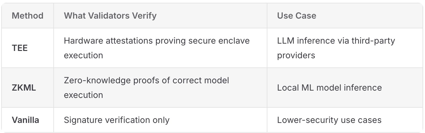关于验证证明,怎么「证明 AI 没骗人」?OpenGradient 给了一个「信任等级菜单」: