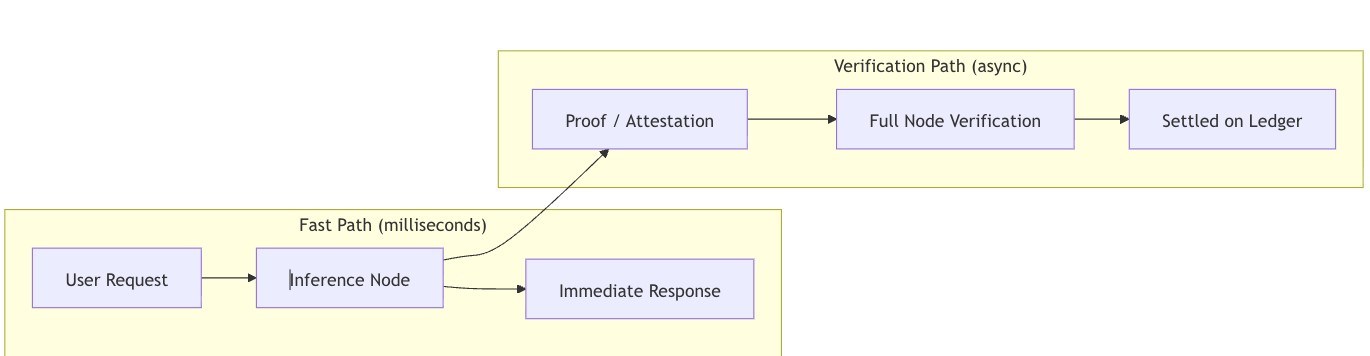 解决方案是将 AI 推理放在链下完成,由专用的推理节点执行模型计算,并生成可验证的证明(如 TEE 或零知识证明);链上节点则只负责验证证明,而不重复运行模型,从而大幅降低成本。