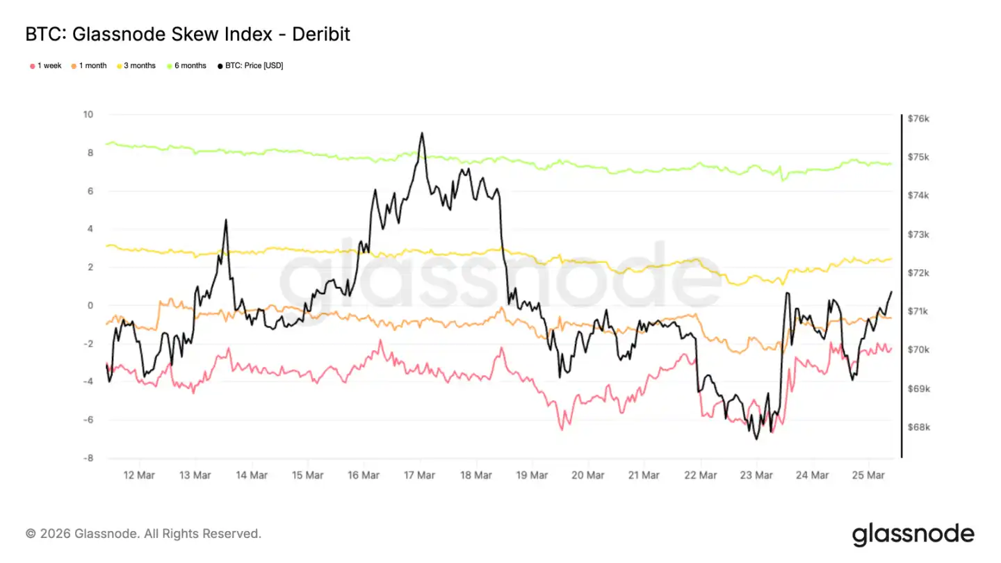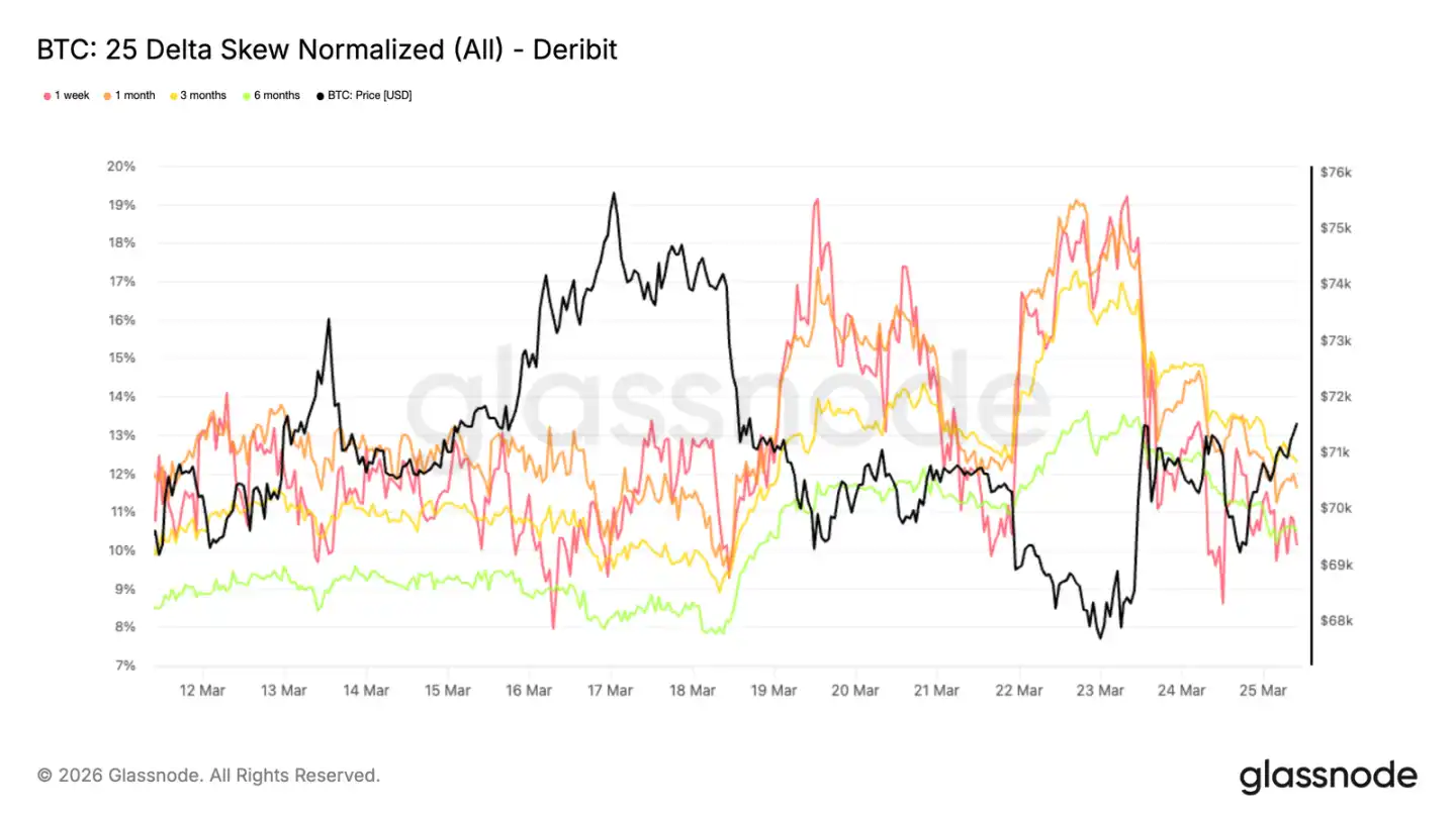 25 delta 偏斜(衡量相同 delta 值下看跌期权与看涨期权相对成本的指标)在本周早些时候比特币价格跌破 68,000 美元时,1 周与 1 个月期限合约的偏斜值攀升至 18% 至 19% 区间。这清晰表明,在地缘政治不确定性加剧的背景下,一旦价格显露疲态,市场对短期下行保护的需求便迅速升温。