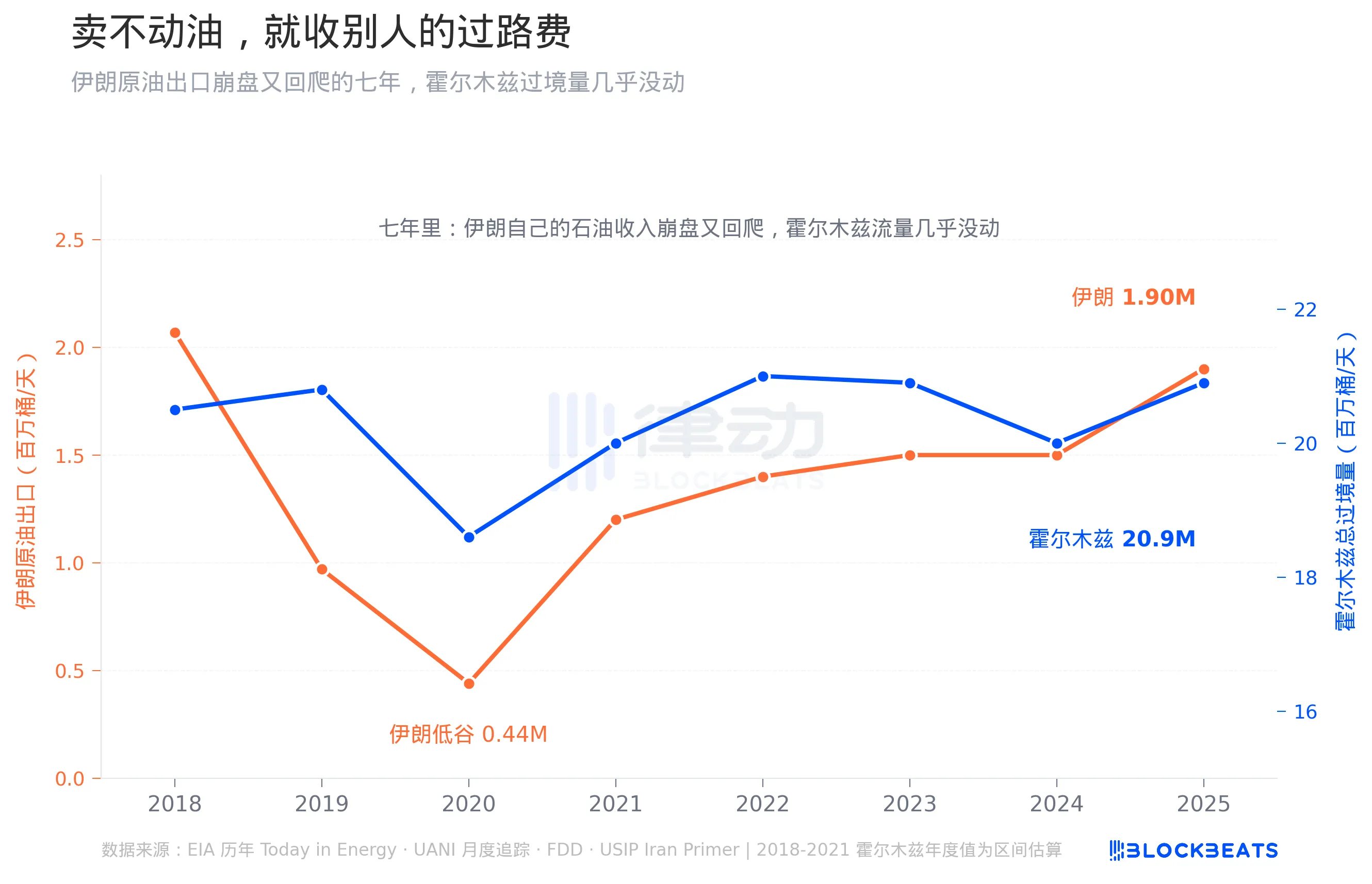 右轴是同一条水道的总过境量。据 EIA 历年报告,2018 年是 20.5 百万桶每天,2022 年 21 百万桶,2024 年 20 百万桶,2025 年上半年 20.9 百万桶。七年里,伊朗自己的油从家门口出得越来越少,但邻居家的油一桶也没少走。这条水道在伊朗看来,一直是「别人的生意,我的门」。