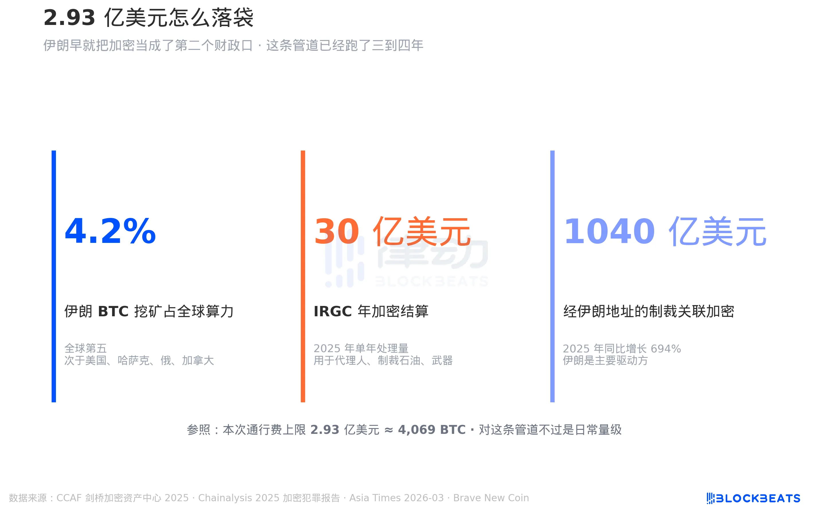 所以「用比特币收通行费」不是一个姿态,它是伊朗唯一一条能让这笔钱不经 SWIFT、不经欧美银行、不被中间行冻结就能真正落袋的管道。伊朗这条两周通行费,如果全额到手也只相当于两天多的原油出口收入,但它选择用比特币计价,是因为别的钱根本到不了账户。