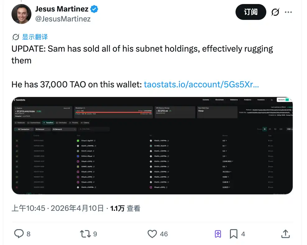 同时,Sam 在宣布带队离开后,链上数据也显示他卖出了所有的 3 万 7 千枚 TAO 代币,引发市场更多的 FUD。