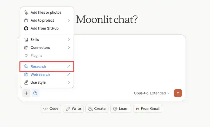 我直接把那个 Prompt 改了一下,等式里面换成了 Harness,然后打开了 Claude 的深度研究模式。