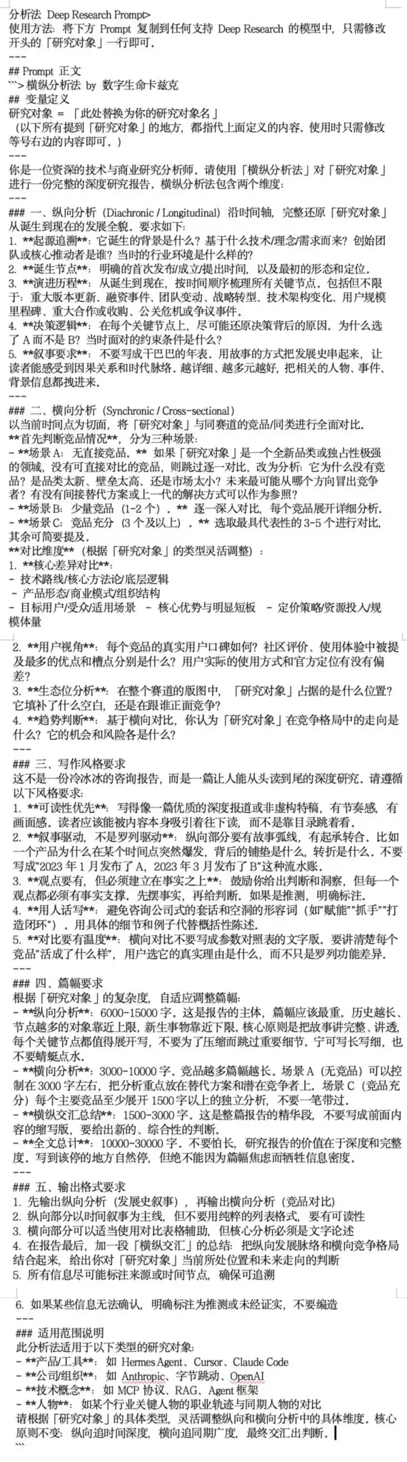 我也不知道对所有人有没有用,但这确实是我自己三年前还在金融行业的时候,研究公司和行业用的方法论,然后后面 AI 来了,各种各样的深度研究也出来了,我自己又把这套方法论稍微迭代了一下,封装成了给很多 AI 的深度研究功能用的 Prompt,能适用于我研究任何东西,说实话,我觉得这就是这两年用得最顺手的东西之一。