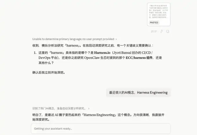 然后 Claude 会跟我确认一下 Harness 到底是个什么东西,我就补充了一下。