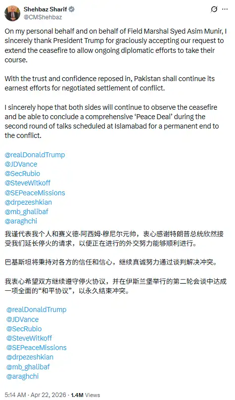 巴基斯坦总理 Shehbaz Sharif 在一份声明中感谢特朗普延长停火,「为持续推进的外交努力争取时间,让其得以顺利展开」。