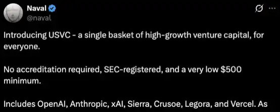 编者按:近日,《纳瓦尔宝典》作者、硅谷知名投资人 Naval Ravikant 在社交媒体上推出名为 USVC(U.S. Venture Capital)的投资产品,主打「无需合格投资者资格、500 美元起投」,并打包包括 OpenAI、Anthropic、xAI、Vercel 等在内的一篮子高增长初创公司股权。其叙事清晰而熟悉:让普通投资者也能进入原本只属于少数人的风险投资市场,实现「机会的民主化」。
