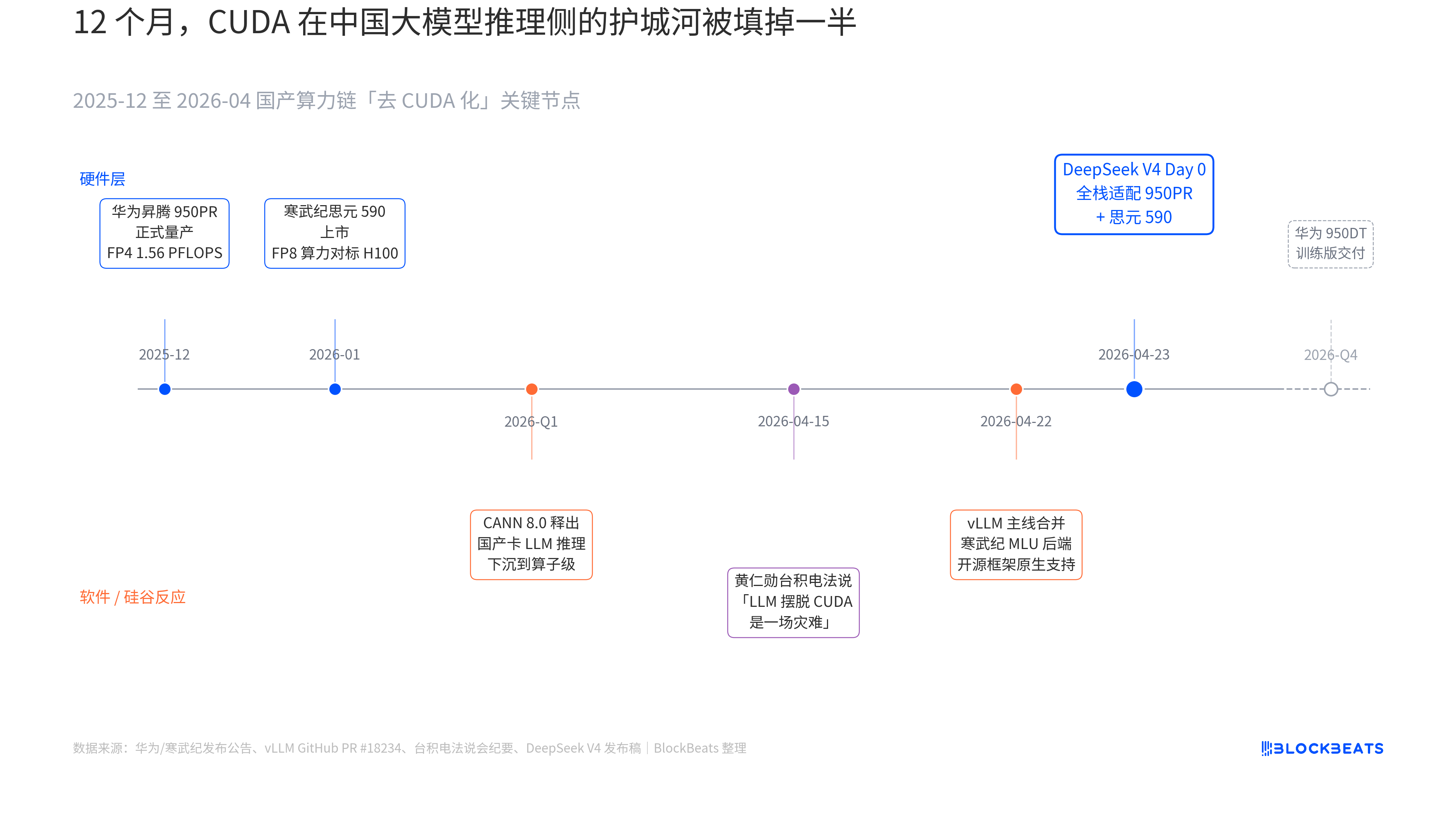 V4 发布稿里有一行字之前从未出现在任何中国大模型的官方文档里:「Day 0 全栈适配寒武纪思元 590 与华为昇腾 950PR,部署代码同步开源。」这一行字的分量,要把过去 12 个月里三条平行展开的暗线接到一起才看得明白。这三条暗线分别属于硬件、软件和硅谷的反应。