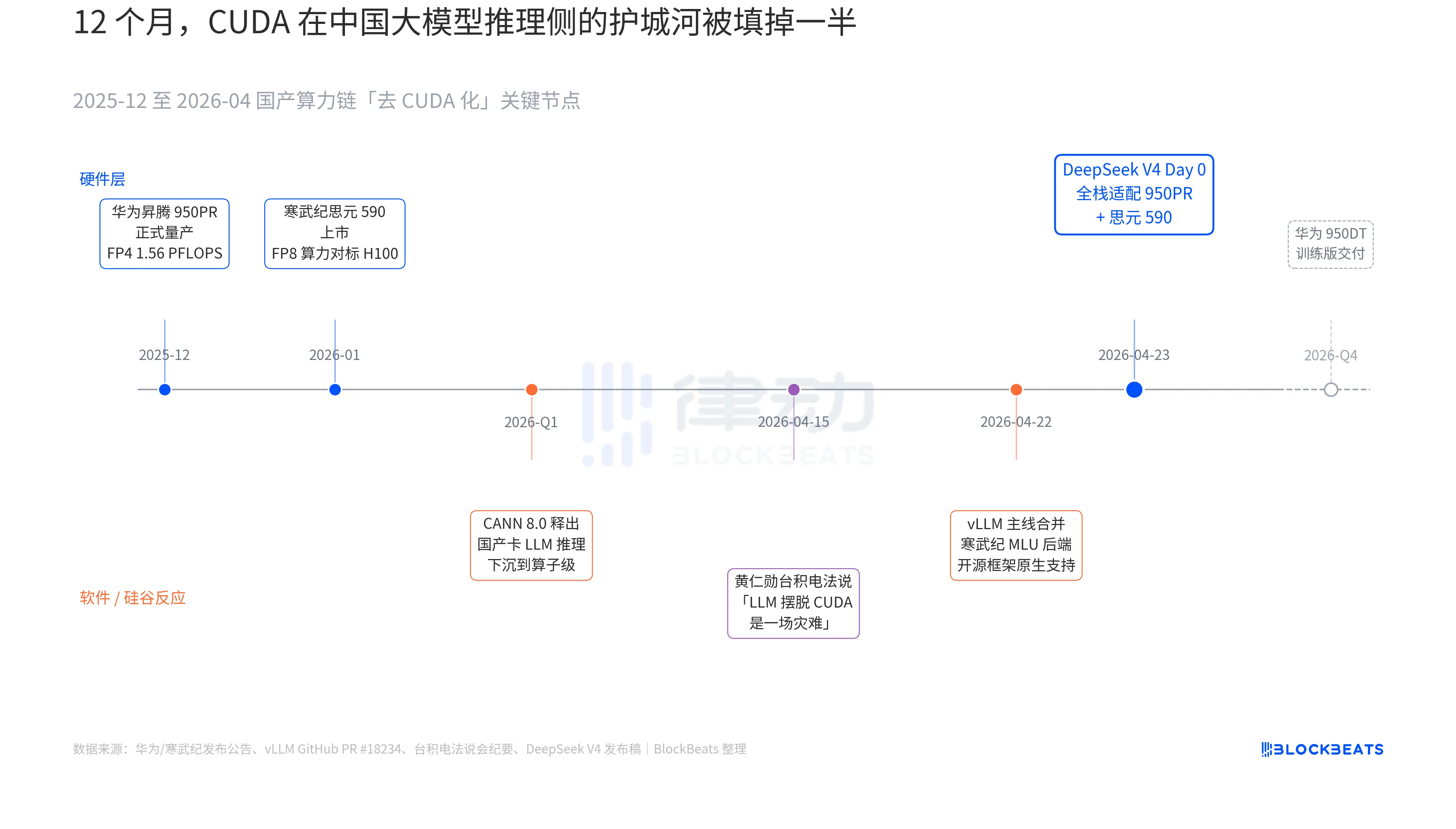 第三条暗线来自硅谷。4 月 15 日,黄仁勋在台积电的法说会上被分析师追问中国国产算力的进展,原话冷峻而具体,「如果他们真的能让 LLM 摆脱 CUDA,对我们来说会是一场灾难(a disaster)」。九天之后,DeepSeek 用一行 Day 0 公告给出了答案。