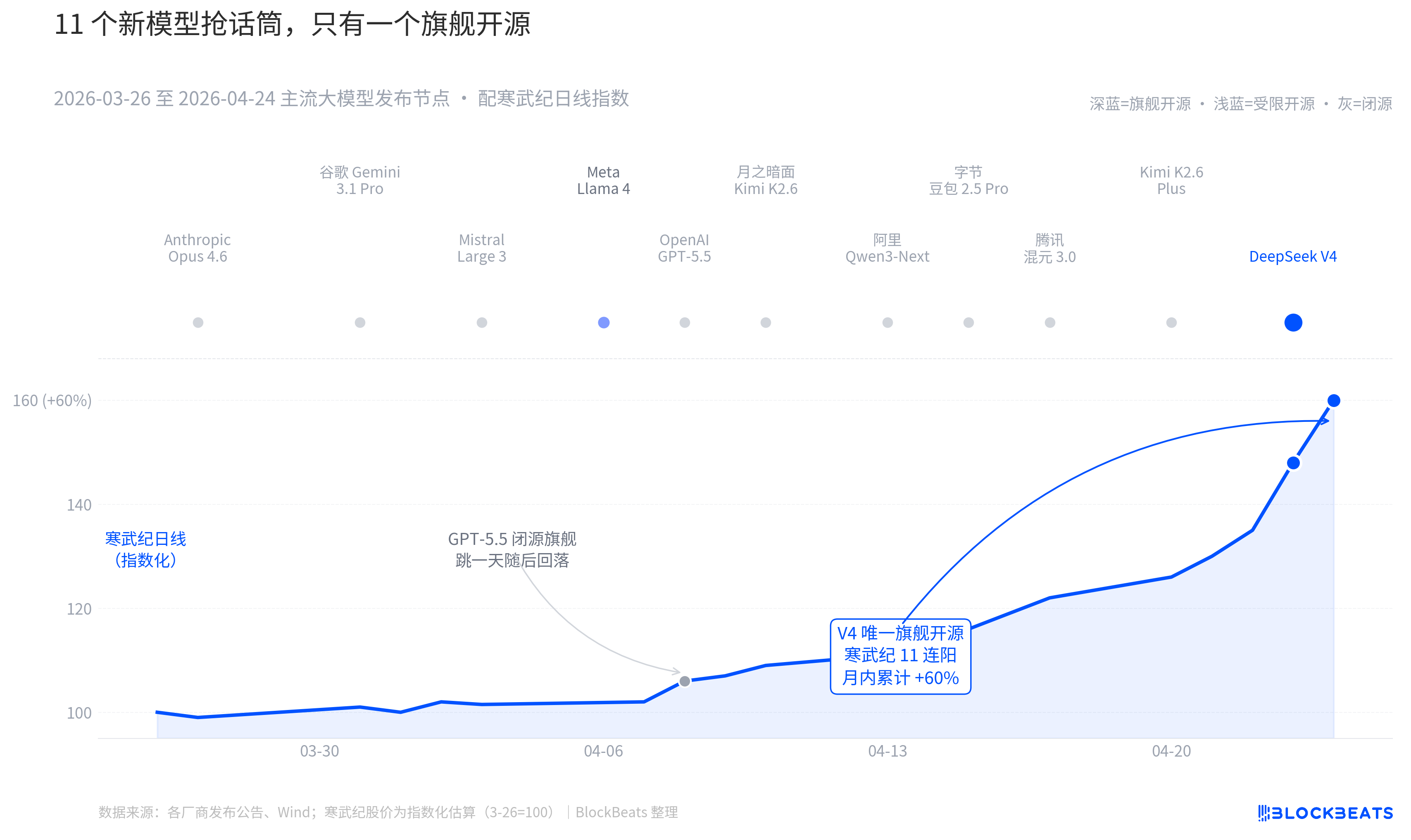 平均下来,每 2.7 天就有一个新模型出炉。这是连基金经理都来不及读完发布稿的速度。但翻一遍这 30 天的中港 AI 资产 K 线,能在盘面上留下持续痕迹的只有一个名字。4 月 8 日的 GPT-5.5 带动英伟达单日涨 4.2%,一日见顶。然后是 4 月 23-24 日的 DeepSeek V4,带动中港算力链走出连续跳涨。