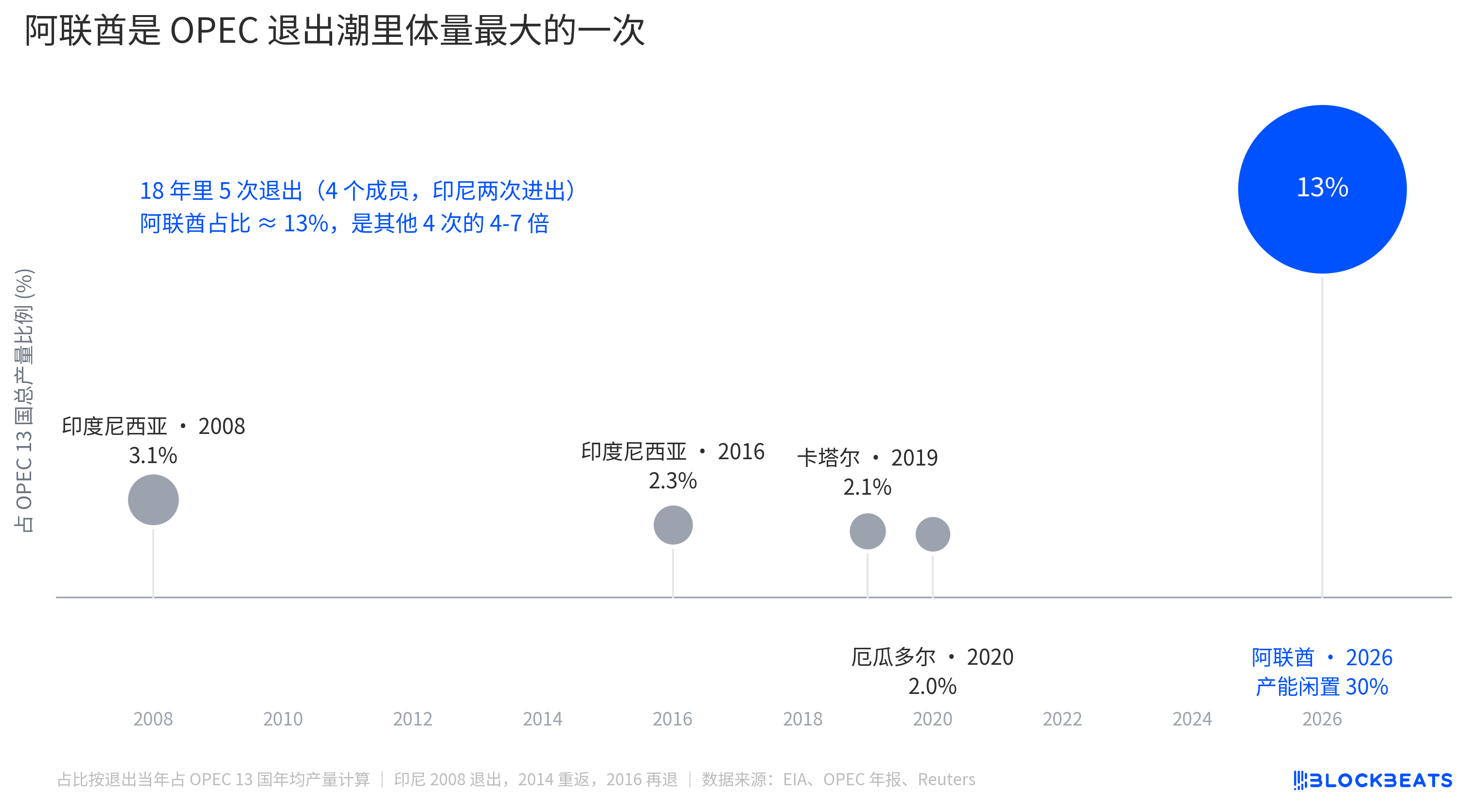 印度尼西亚 2008 年第一次离开(2014 年重返、2016 年再退)、卡塔尔 2019 年退出转向 LNG、厄瓜多尔 2020 年因财政压力退出。这 4 次退出当时,离开成员各自占欧佩克总产量的 2-3.1%。每次都被解读为孤立事件,每次欧佩克的市场份额都没明显受损。