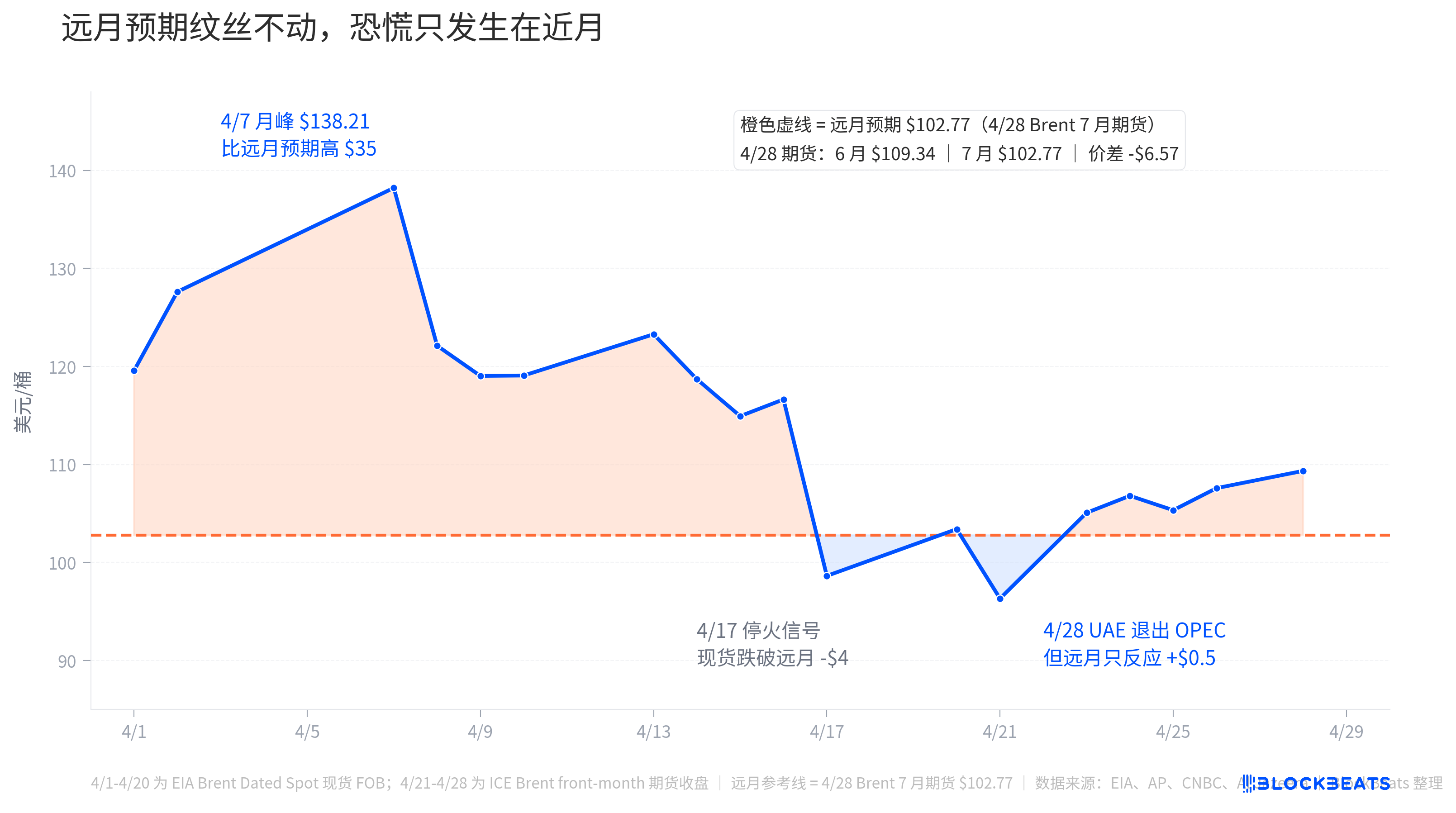 主流报道把阿联酋退出叠进 霍尔木兹 涨势里,看上去像是欧佩克解体在推高油价。期货曲线把两件事拆开了。4 月初 Brent 现货一度比远月贵 35 美元,那是 霍尔木兹 的恐慌溢价。4 月 28 日近-远月价差只有 6.57 美元,这是阿联酋退出加上头条噪音的总和。市场对阿联酋这件事的真实定价,藏在那条几乎没动过的远月线里。