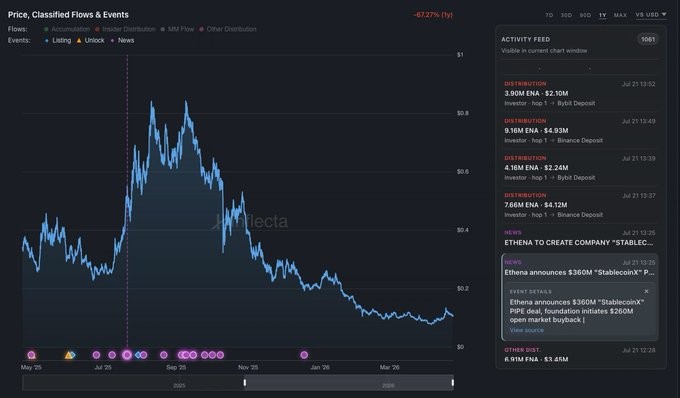 核心问题不在于 ENA 是否通过交易场所被购买,而是这些购买是否代表了公开市场的净吸收,还是其中相当一部分看似公开市场的执行,其实是由 Ethena 关联钱包此前提供给这些场所的 ENA 库存所促成的。
