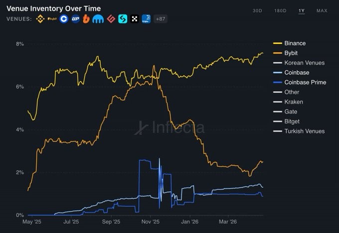 什么可能导致这种转变?数据显示跨场所做市商路由(严重偏向 Bybit),同时伴随持续的投资者分发(主要流向 Binance),以及来自 Coinbase Prime 的一些资金流。