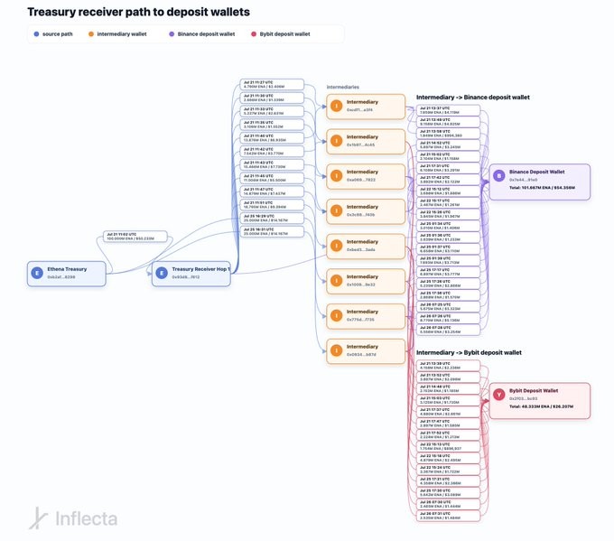 下图显示了一个钱包(11),2024 年从主要国库钱包接收了总供应量的约 8.4%——表明受 Ethena 国库控制——并在 7 月 21 日(PIPE 1 宣布当天)至 7 月 26 日期间,通过九个中间钱包向 Binance 和 Bybit 分发了 1.5 亿枚 ENA。