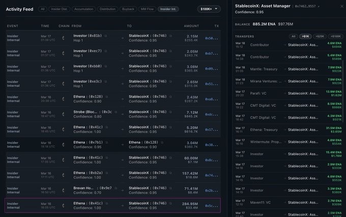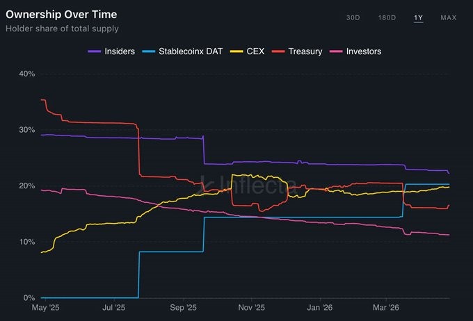 根据 Inflecta 数据,StablecoinX 目前持有 ENA 供应量的 20.3%(约 30.4 亿枚 ENA)。每次大规模积累都对应着国库 / 内部人士余额的相应减少,与备案文件中描述的结构一致。