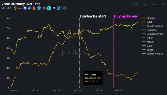 这里突出的是时间点:库存似乎在执行前集中在 Bybit,而不是在执行过程中逐步积累。
